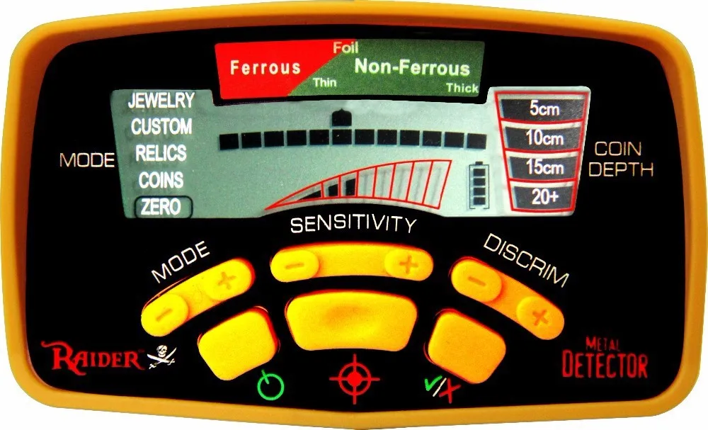 Mode—Indicates which of the five detection modes (Zero, Jewelry, Custom,Relics or Coins) has been selected by highlighting the corresponding word on the LCD screen.